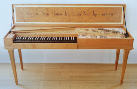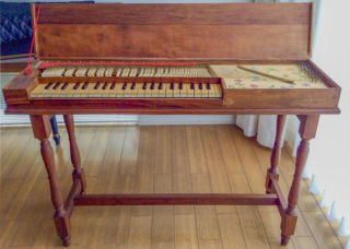 エジンバラ大学楽器博物館の学芸員であるダリル・マーティン製作。博物館所有楽器を復元したもので、長さは1m10cm、重さは8Kg、ショートオクターブ。リュックのように背中に背負って持ち運びができるカバー付きのお陰で、この楽器はドーバー海峡を越えてイギリスからフランス、オランダへ、また日本へと旅を続けてきました。頑丈で持ち運びの楽なクラヴィコード は今までに病院、学校、教会、サロンコンサートで多く演奏する機会があり、これからも旅を続けます。